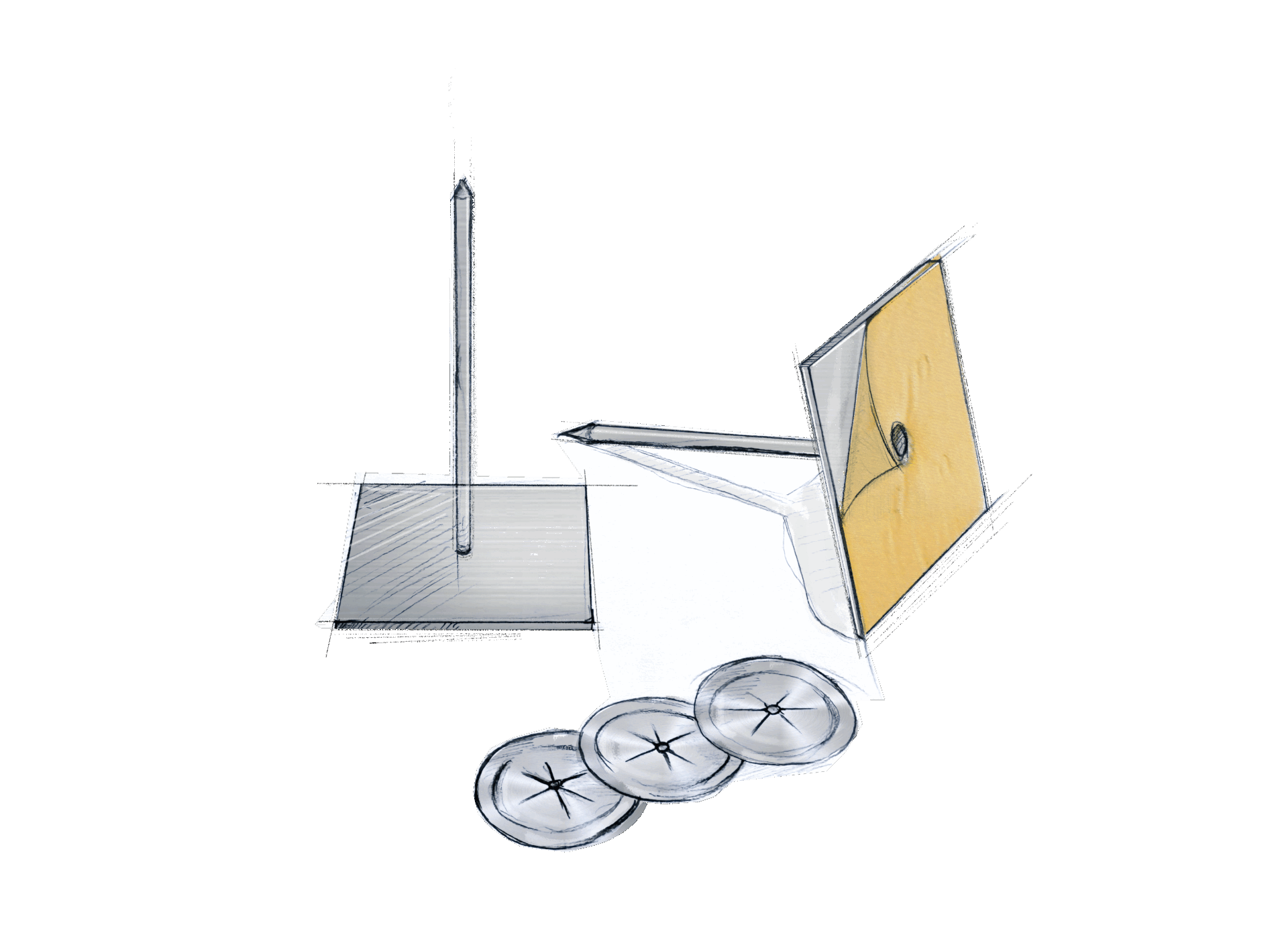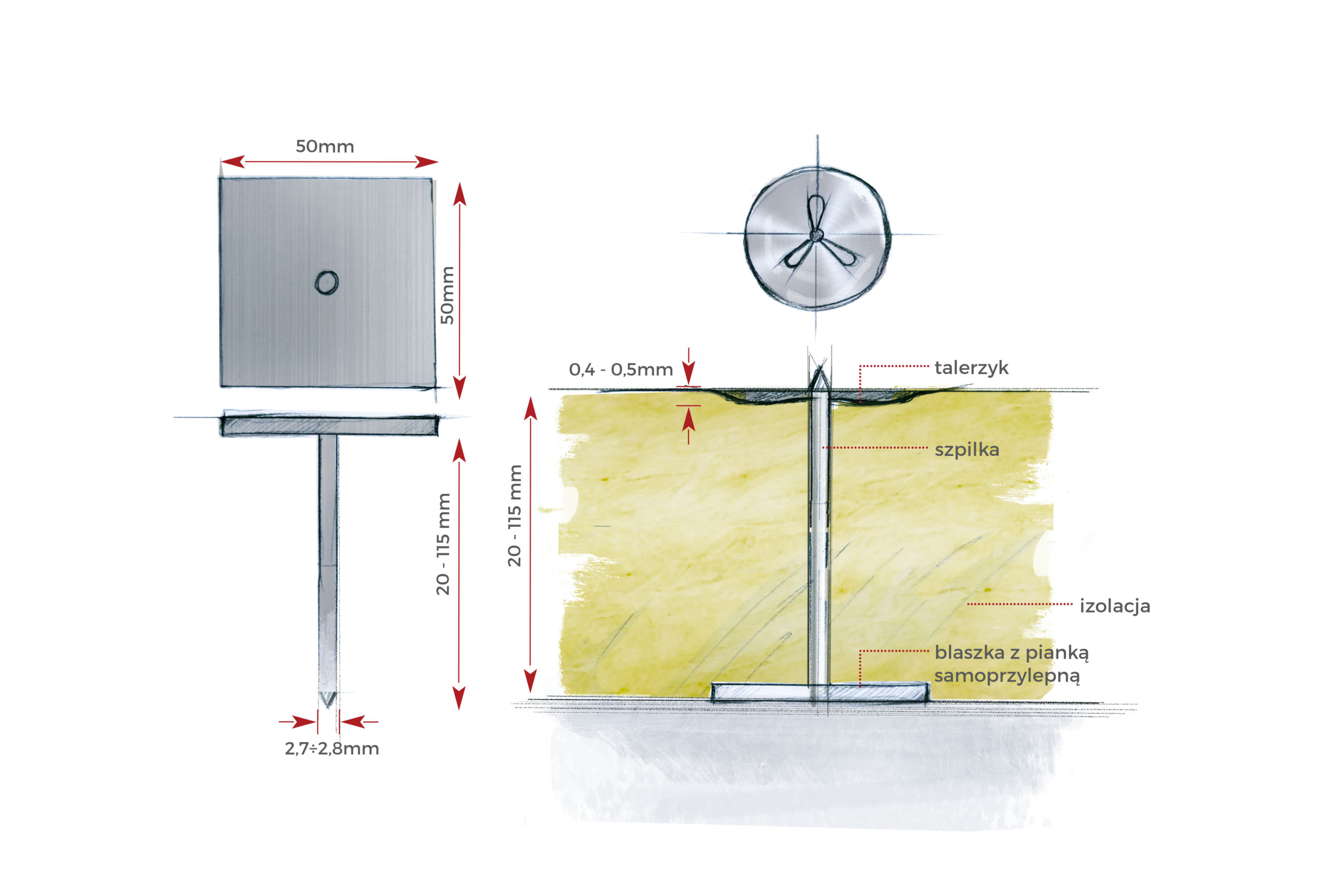 Składają się z metalowej podstawy o wymiarach 50×50 mm pokrytej specjalistyczną pianką samoprzylepną, do której przymocowany jest trzpień o długości dopasowanej do grubości mocowanej izolacji.